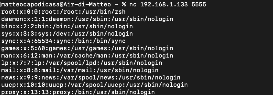Se volessimo valutare il testo in output di un singolo comando, per poi poterlo recuperare da remoto, basterebbe usare l’opzione -e execute: quest’ultima eseguirà il comando e non appena si avrà una connessione in entrata, l’output del comando verrà inviato a noi che ci saremo connessi alla porta 5555: